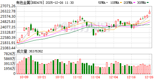 12月26日,A股有色金属走强,截至早间收盘,板块上涨1.82%,涨幅居两市行业板块前列。个股方面,国城矿业、深圳新星涨停,江西铜业暴涨9.97%,铜陵有色、云南铜业、西部矿业、西藏珠峰等涨超5%,和胜股份、中国铝业、白银有色、南山铝业、闽发铝业、紫金矿业等多股涨超4%。
