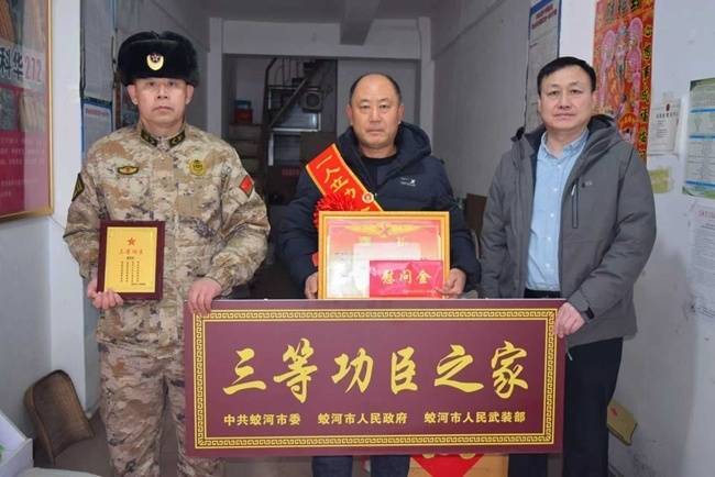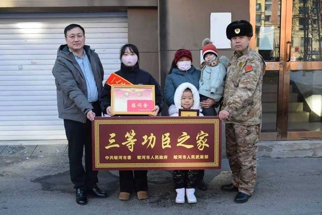 新年伊始凡资配,尊崇情浓。为进一步弘扬拥军优属光荣传统,营造“一人立功、全家光荣”的浓厚社会氛围,1月6日,蛟河市退役军人事务局联合市人武部组成慰问组,先后前往现役军人姚伟龙、朱崇山家中,送去满载荣誉的立功喜报、慰问金及“三等功臣”牌匾,向军人家庭传递党和政府的关怀与温暖。