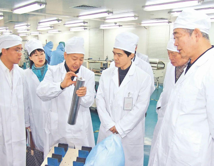 欧阳明高(前排右二)在了解电池企业生产情况。